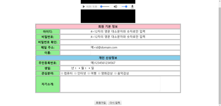 1 2 3 4 5 6 7 8 9 10 11 12 13 14 15 16 17 18 19 20 21 22 23 24 25 26 27 28 29 30 31 32 33 34 35 36 37 38 39 40 41 42 43 44 45 46 47 48 49 50 51 52 53 54 55 56 57 58 59 60 61 62 63 64 65 66 67 68 69 70 71 72 73 74 75 76 77 78 79 80 81 82 83 84 85 86 87 88 89 90 91 92 93 94 95 96 97 98 99 100 101 102 103 104 105 106 107 108 109 110 111 | <!DOCTYPE html> <html> <head> <meta charset="UTF-8"> <title>회원 가입 페이지</title> </head> <body align="center" marginwidth="0" marginheight="10" > <embed src="넌 행복해.mp3"> <form method="post" action="mailto:rmlfa96@naver.com"> <table width="800" height="250" border="1" align="center"> <tr align="left"> <td align="center" colspan="2" bgcolor="pink"><B>회원 기본 정보</B></td> </tr> <tr align="left"> <td align="center" bgcolor="lightgreen"><b>아이디:</b></td> <td><input type="text" name="my_id" size="20" maxlength="12">4~12자의 영문 대소문자와 숫자로만 입력</td> </tr> <tr align="left"> <td align="center" bgcolor="lightgreen"><b>비밀번호:</b></td> <td><input type="password" name="my_pwd" size="20" maxlength="12">4~12자의 영문 대소문자와 숫자로만 입력</td> </tr> <tr align="left"> <td align="center" bgcolor="lightgreen"><b>비밀번호 확인:</b></td> <td><input type="password" name="my_pwd" size="20" maxlength="12"></td> </tr> <tr align="left"> <td align="center" bgcolor="lightgreen"><b>메일 주소:</b></td> <td><input type="text" name="my_add" size="20">예>id@domain.com</td> </tr> <tr align="left"> <td align="center" bgcolor="lightgreen"><b>이름:</b></td> <td><input type="text" name="my_name" size="20" maxlength="7"></td> </tr> <tr> <td align="center" colspan="2" bgcolor="skyblue"><B>개인 신상정보</B></td> </tr> <tr align="left"> <td align="center" bgcolor="lightgreen"><b>주민등록번호:</b></td> <td><input type="text" name="my_name" size="20" maxlength="13">예)1234561234567</td> </tr> <tr align="left"> <td align="center" bgcolor="lightgreen"><b>생일:</b></td> <td><input type="text" name="my_year" size="4" maxlength="4">년<select> <option>1</option> <option>2</option> <option>3</option> <option>4</option> <option>5</option> <option>6</option> <option>7</option> <option>8</option> <option>9</option> <option>10</option> <option>11</option> <option>12</option> </select>월<select> <option>1</option> <option>2</option> <option>3</option> <option>4</option> <option>5</option> <option>6</option> <option>7</option> <option>8</option> <option>9</option> <option>10</option> <option>11</option> <option>12</option> <option>13</option> <option>14</option> <option>15</option> <option>16</option> <option>17</option> <option>18</option> <option>19</option> <option>20</option> <option>21</option> <option>22</option> <option>23</option> <option>24</option> <option>25</option> <option>26</option> <option>27</option> <option>28</option> <option>29</option> <option>30</option> <option>31</option> </select>일</td> </tr> <tr align="left"> <td align="center" bgcolor="lightgreen"><b>관심분야:</b></td> <td><input type="checkbox" name="comp">컴퓨터 <input type="checkbox" name="inter">인터넷 <input type="checkbox" name="trip">여행 <input type="checkbox" name="movie">영화감상 <input type="checkbox" name="music">음악감상</td> </tr> <tr align="left"> <td align="center" bgcolor="lightgreen"><b>자기소개:</b></td> <td><textarea name="my_intro" cols="80" rows="5"></textarea></td> </tr> </table> <br> <br> <input type="submit" value="회원가입"> <input type="reset" value="다시 입력"> </form> </body> </html> |